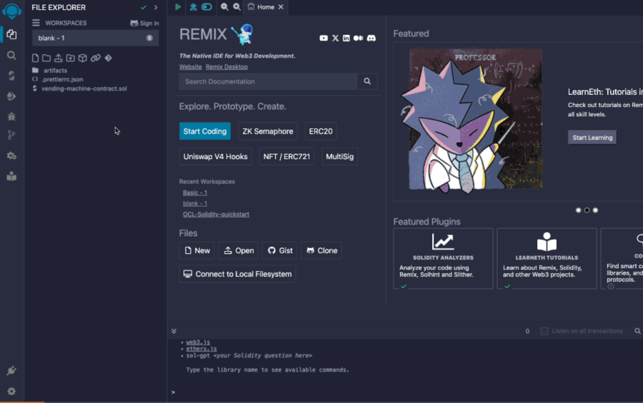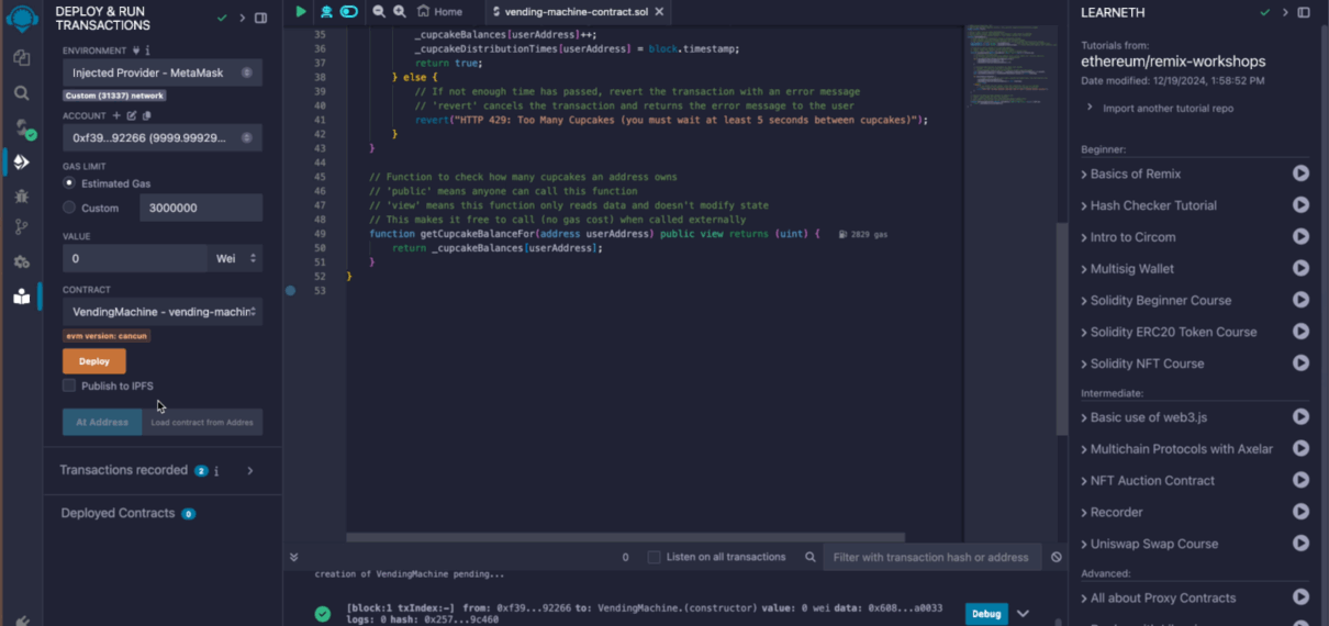• In Remix, deploy the VendingMachine contract to the Localhost network, then go to the "Deploy & Run Transactions" tab and click "Deploy."
